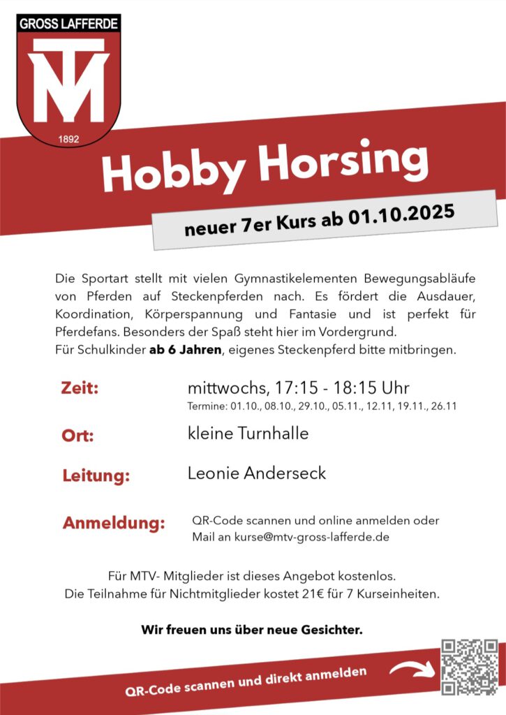 Wenn man von Groß Lafferde in die finnische Hauptstadt Helsinki fahren möchte, braucht man mit dem Auto über 22 Stunden für die 1.855 km. Diese Strecke muss man aber nicht für die neue finnische Trendsportart „Hobby Horsing“ – auf Finnisch „Kilpalulomake“ – fahren. Ab 07.11.2020 können Kinder ab 6 Jahren diese beim MTV Groß Lafferde ausprobieren und viel Spaß haben. Der Weg in die Turnhalle Südstraße ist dabei denkbar kurz.