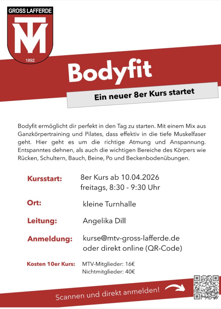 Bodyfit ermöglicht dir perfekt mit einem Mix aus Ganzkörpertraining und Pilates, dass effektiv in die tiefe Muskelfaser geht sanft in den Tag zu starten. Hier geht es um die richtige Atmung und Anspannung. Entspanntes dehnen, als auch die wichtigen Bereiche des Körpers wie Rücken, Schultern, Bauch, Beine, Po und Beckenbodenübungen. Gern einfach mal reinschnuppern.