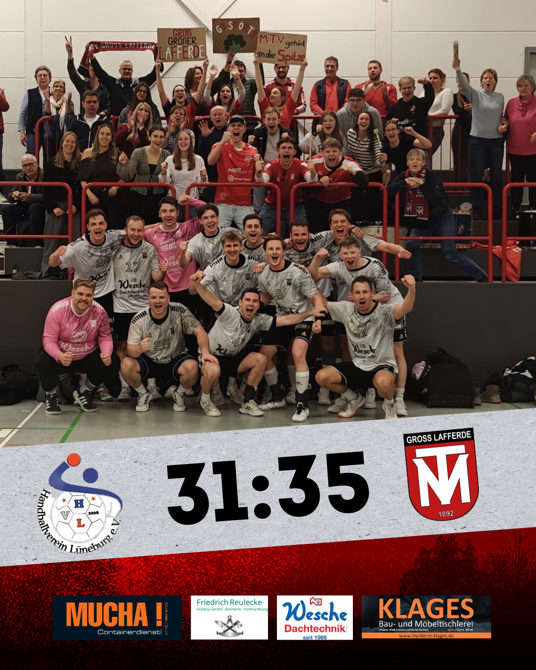 Die Basis für diesen Erfolg wurde bereits vor dem Anpfiff gelegt. Mit einem Reisebus machten sich die Lafferder mit zahlreichen Fans auf den Weg nach Lüneburg. In der Halle sorgten die Fans für eine Atmosphäre, die den MTV förmlich beflügelte – von Auswärtsstimmung war keine Spur.