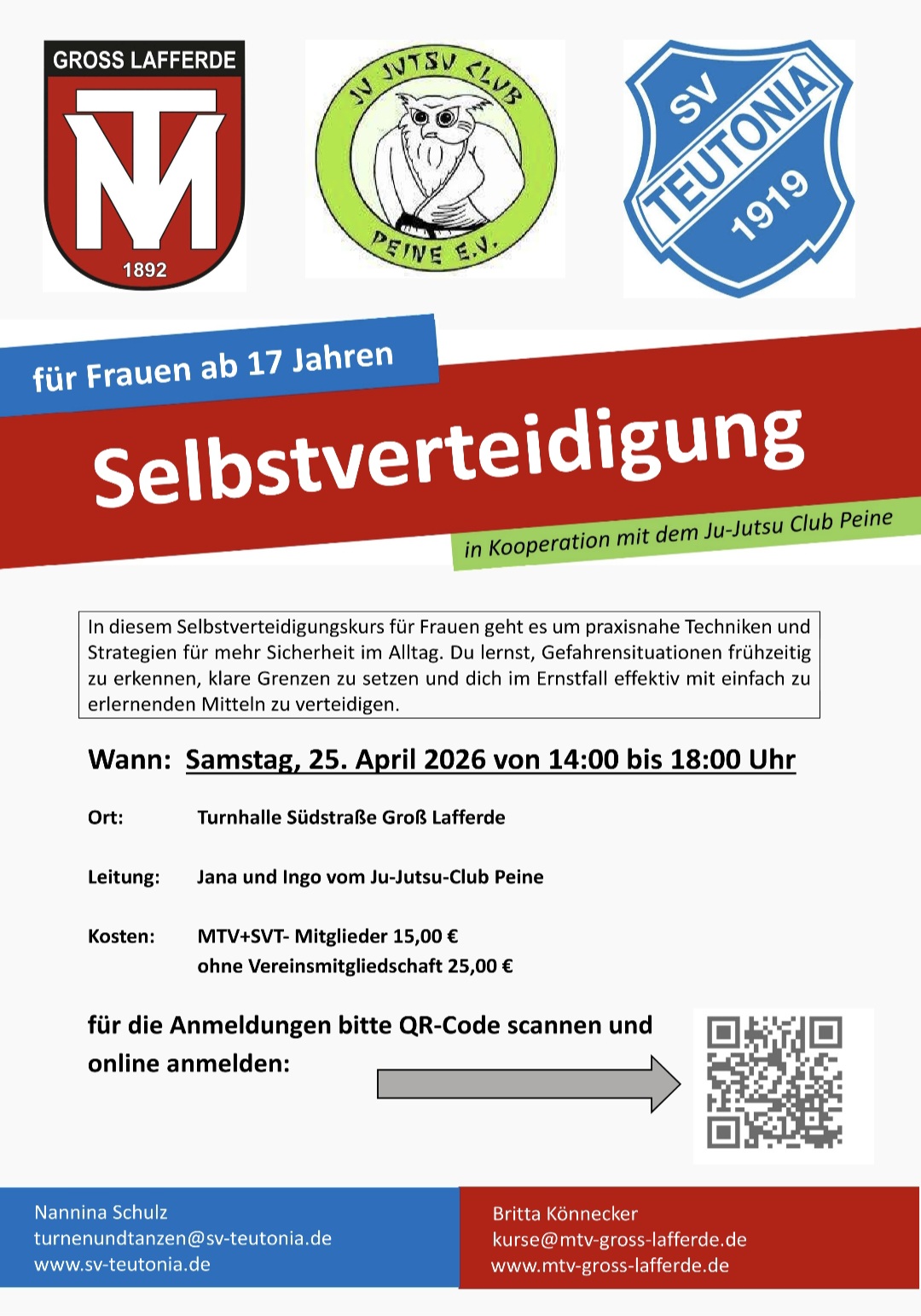 Ein Workshop für Frauen zur Selbstverteidigung findet am 25. April 2026 in Zusammenarbeit mit dem Ju-Jutsu-Club Peine statt, weiteres entnehmt bitte dem Plakat.